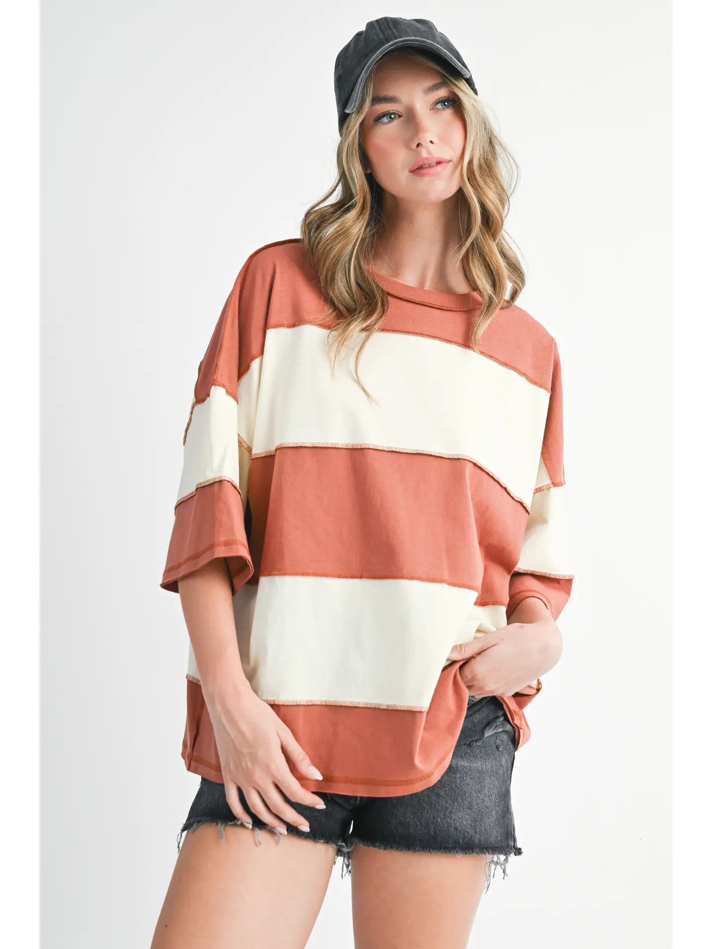 This relaxed-fit T-shirt features bold navy and cream stripes with exposed seams for a casual, effortless vibe. Its oversized silhouette and breezy style make it perfect for pairing with denim shorts or leggings.