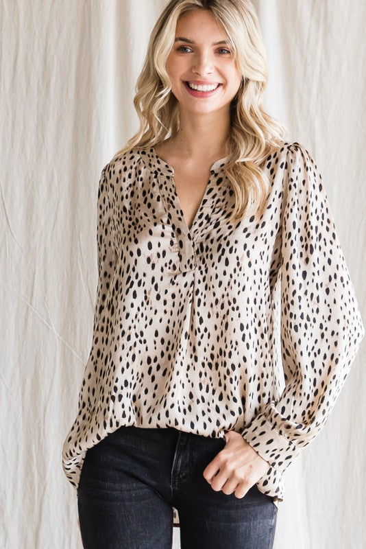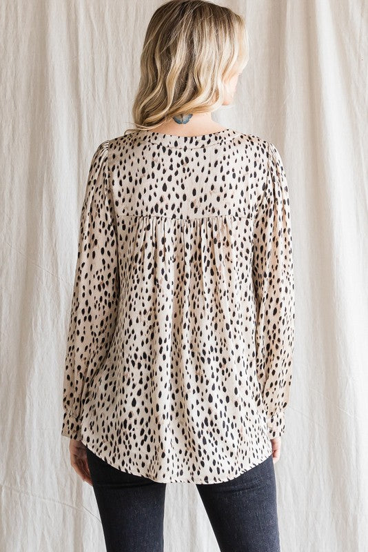 Dot print collarless top with an open fold neckline, back shirring detail, long sleeves and buttoned cuffs.