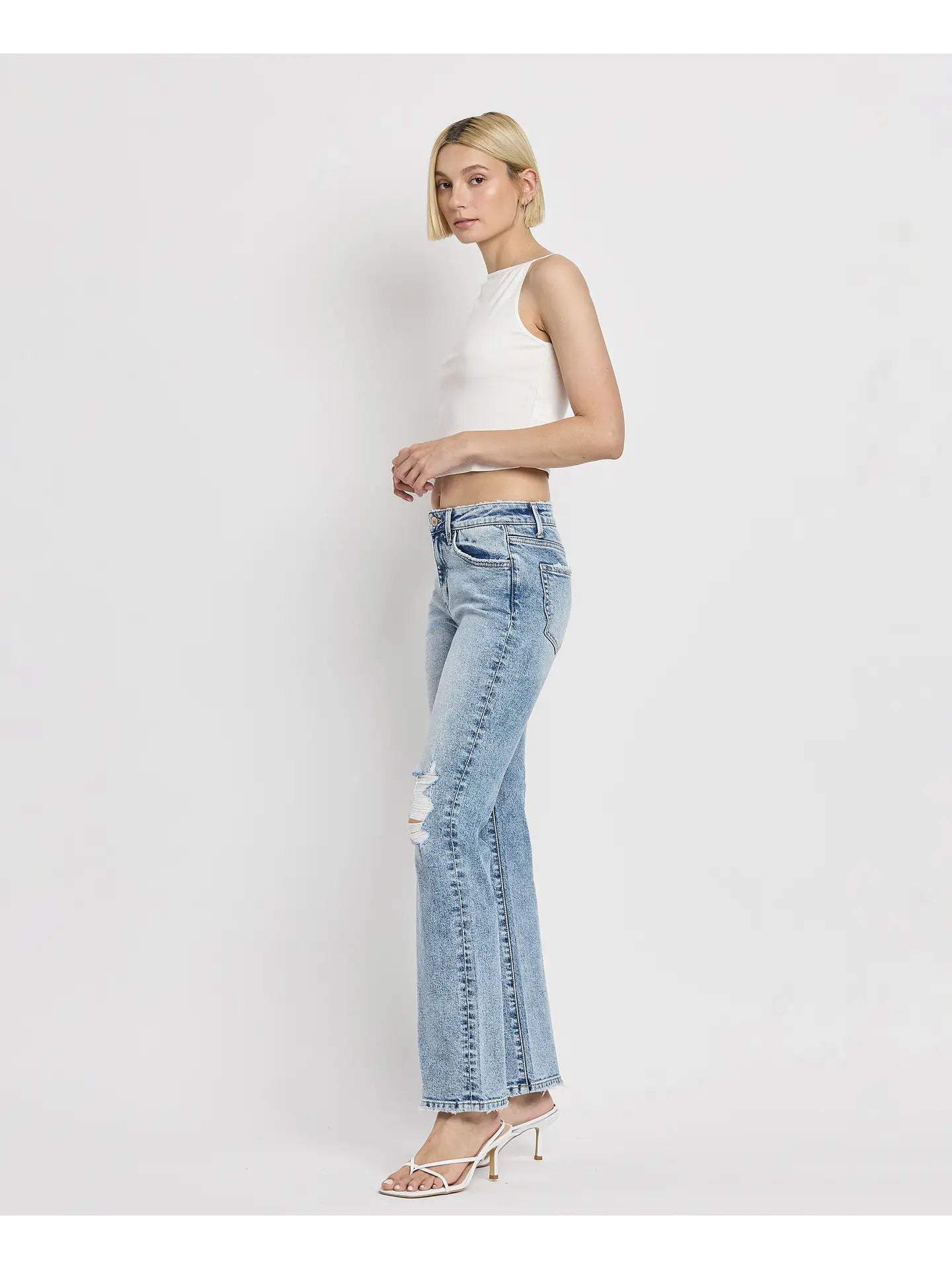 Comfort stretch denim, high rise waist, distressed detail, full length, straight jeans