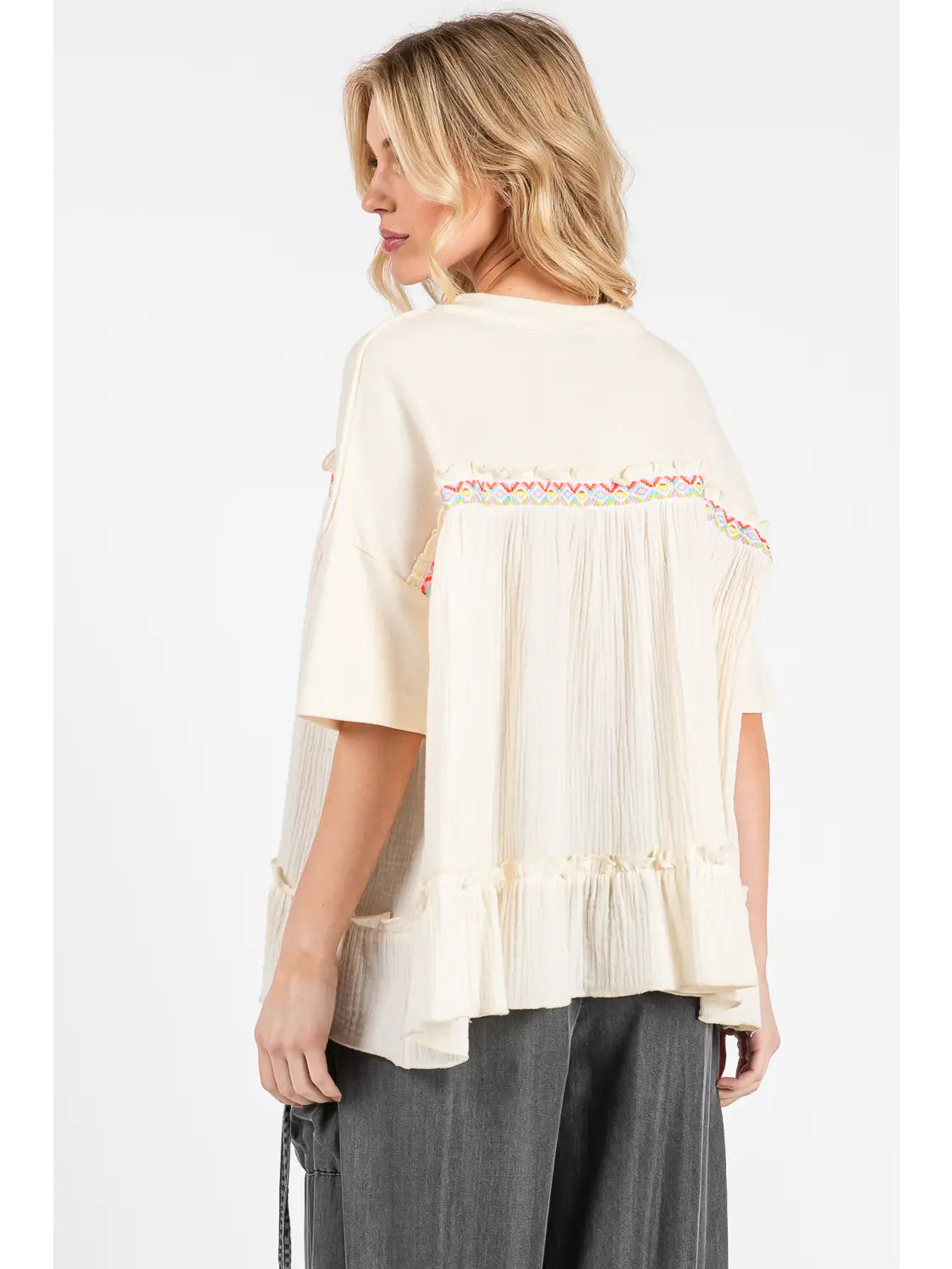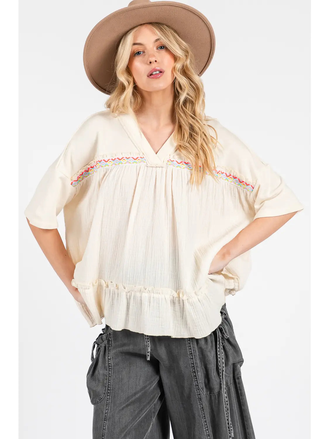 - The top embodies a boho-chic vibe, with its breezy fit embroidered accents, and playful ruffles