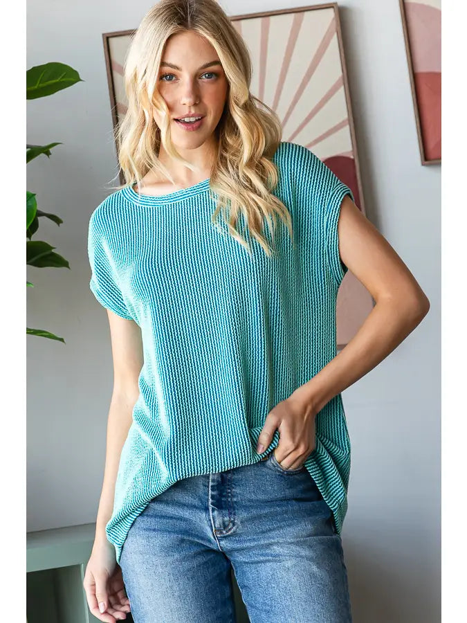A SOLID RIBBED TOP FEATURING A ROUND NECK, SHORT SLEEVES, CURVED HEM, AND A RELAXED FIT.