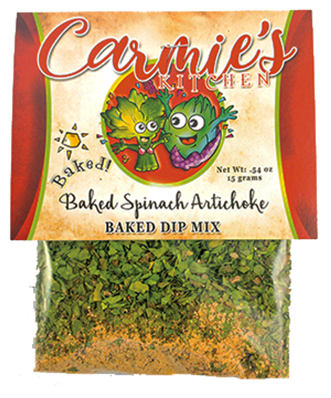 Baked and served warm, this dip is an appetizing blend of lots of spinach and artichokes with a hint of cayenne. Add sour cream or a mixture of sour cream and mayo to create 2 cups of a delicious dip! We recommend serving with potato chips, pretzels, toasted bread slices, or with your favorite vegetables. You can also prepare a cheeseball by adding to 16 oz softened cream cheese. Allergen: dairy. Carmie's dip mixes make the perfect stocking stuffer, hostess gift, holiday gift, or holiday party addition!