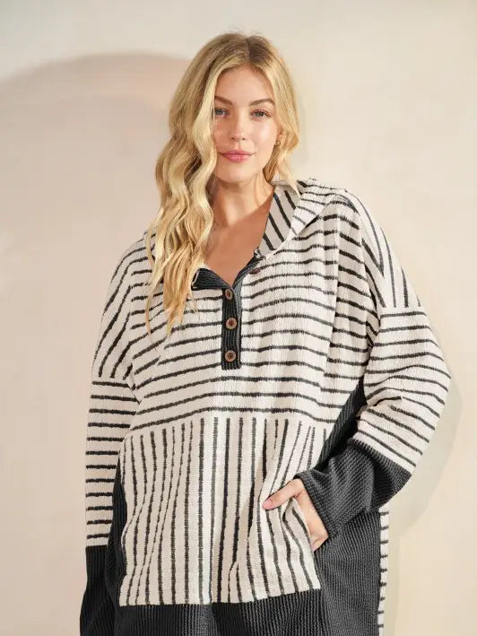 LONG SLEEVE JACQUARD STRIPE AND SOLID URBAN RIB CONTRAST HOODIE TOP WITH KANGAROO POCKET AND FRONT BUTTON DETAIL