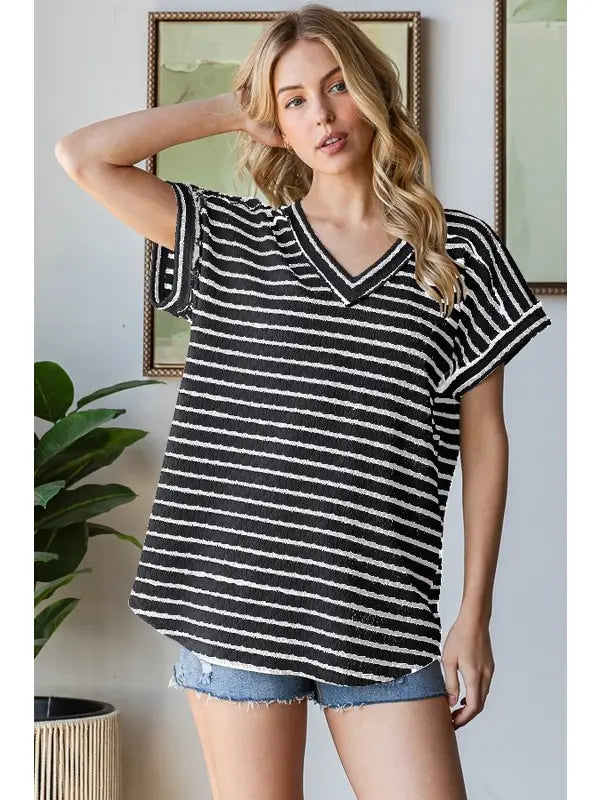 DOLMAN SHORT SLEEVE WITH BAND V NECK URBAN RIBBED STRIPE TOP WITH ROUND HEM AND STITCH DETAIL