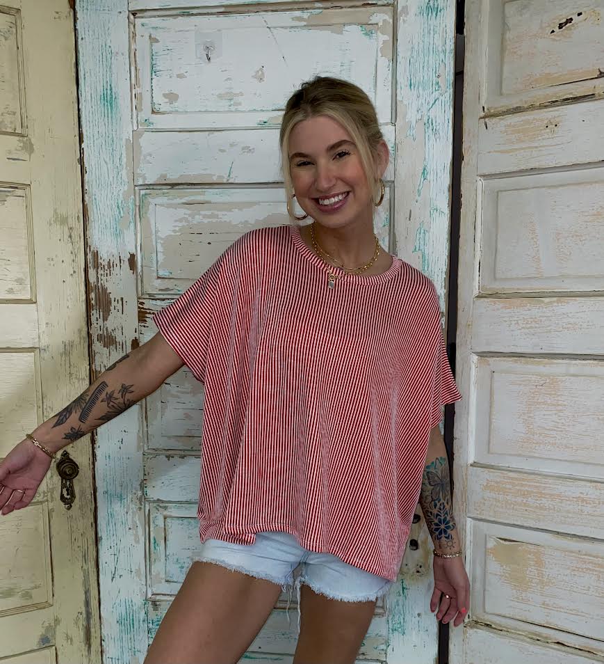 RIBBED STRIPED OVERSIZED SHORT SLEEVE TOP