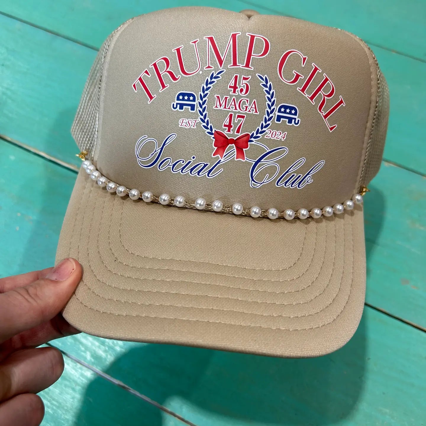 Trump Girl Social Club Trucker hat. Foam front with mesh back and adjustable snapback closure.